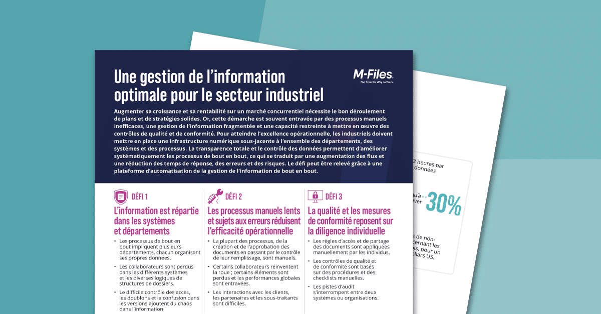 Industrie manufacturière 2025 QMS Buyer's Guide | Choisir un logiciel de gestion de la qualité Agricultural Solutions Distributor (Anonymous) Trelleborg Sealing Solutions Kalmar AB Gestion de la qualité : Améliorer les performances opérationnelles grâce à la gestion de la qualité METTEN Stein+Design Gestion de l'information sur les clients : Un plan de match gagnant pour votre organisation Pourquoi l'automatisation du travail de la connaissance débloque-t-elle l'excellence dans la fabrication ? Surmonter les obstacles à la sécurité et à la conformité avec M-Files eBook : Solutions d'automatisation du travail pour la fabrication Améliorer l'efficacité de la fabrication : Rationaliser les processus avec M-Files Mondi CENTILLION L'IA au service des travailleurs du savoir Une gestion de l'information optimale pour le secteur industriel Livre blanc : Exploiter la puissance de l'IA générative avec Microsoft 365 L'IA au service des travailleurs du savoir Tirer profit de la Knowledge Work Automation Schera Innisfree HL Technology Freeze-Dry Foods Coopérative Norco Kavanagh Burra Foods Australia Wijbenga Vigor Works Vahterus